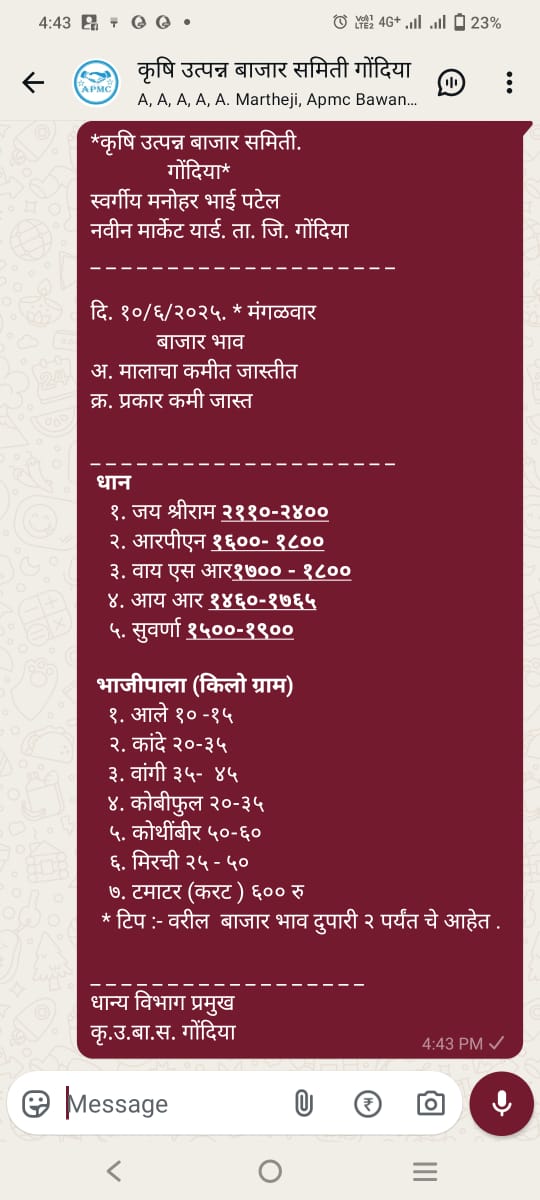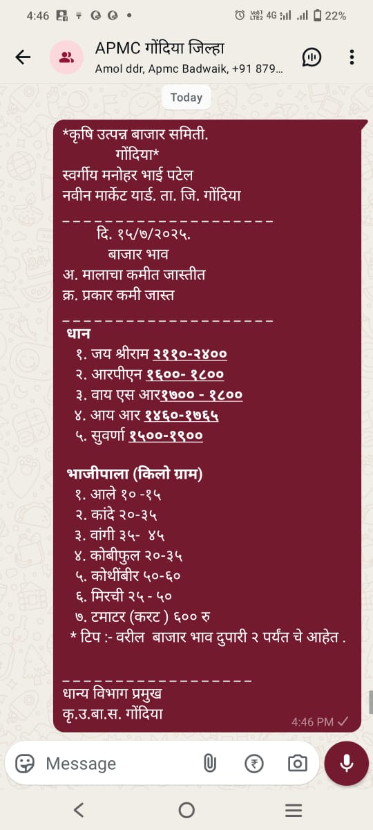 व्हॉट्स अप संदेश तर्फे बाजार भावाची माहिती पुरविण्यात येते.
